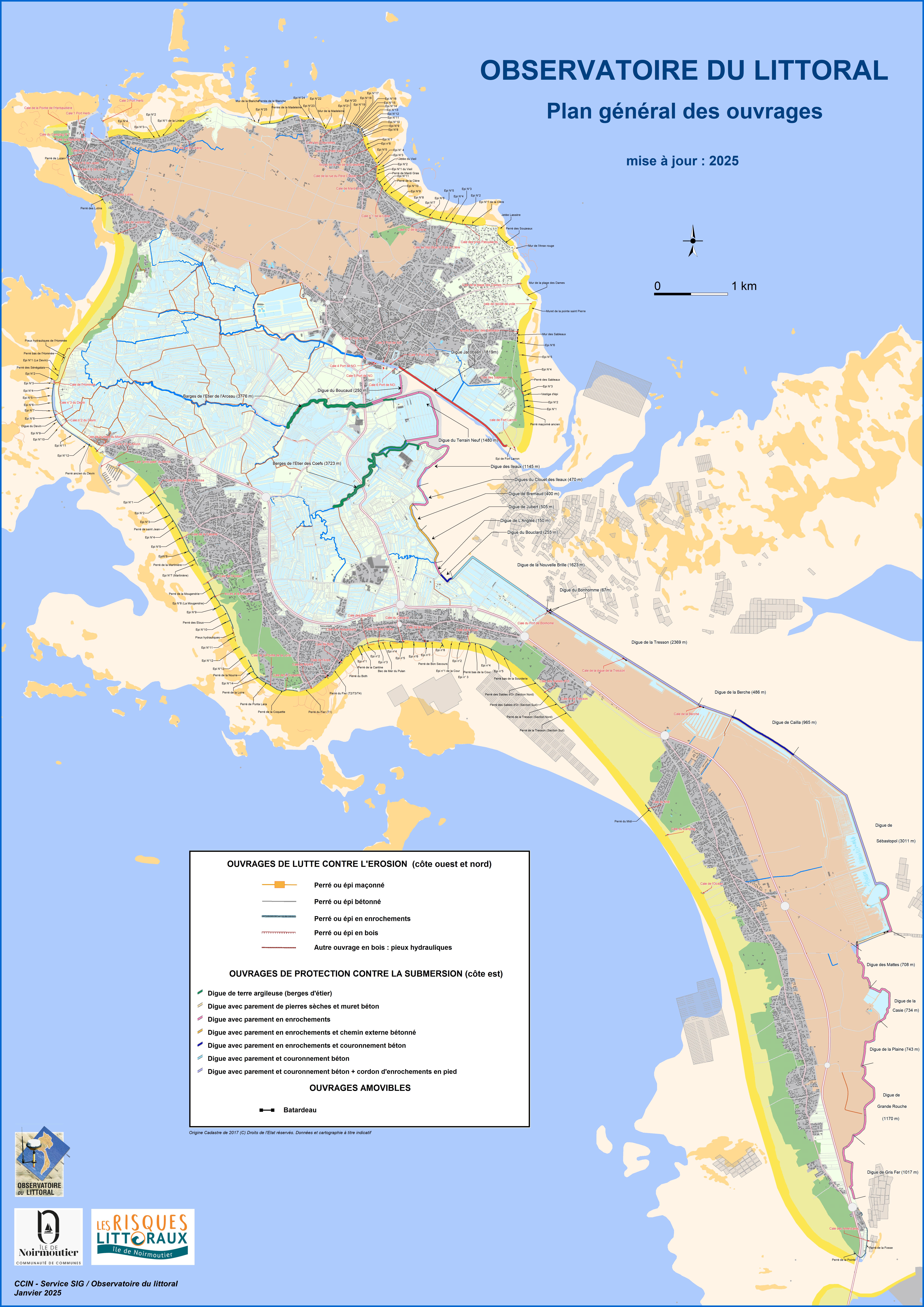 Sur l’île de Noirmoutier, de nombreux ouvrages de protection ont été mis en place pour lutter contre les risques d'inondation. Ces infrastructures, certaines anciennes et d’autres récemment confortées ou rehaussées, jouent un rôle clé dans la sécurisation du territoire. En tant que gestionnaire de ces ouvrages, la Communauté de Communes exerce une compétence fondamentale dans la protection du territoire et la sécurité des habitants.